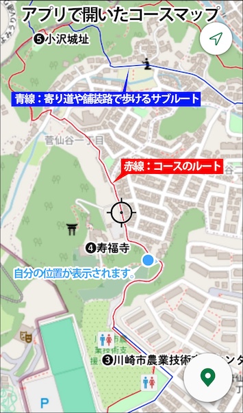 アプリをインストール、スマホを見ながらまち歩き。オフラインでも自分の現在地を見ながら歩くことができます。
